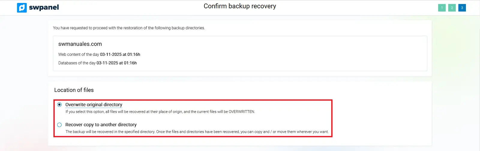 Després de seleccionar els backups, hauràs de decidir si vols sobreescriure els fitxers en el directori original o recuperar-los en un directori diferent.