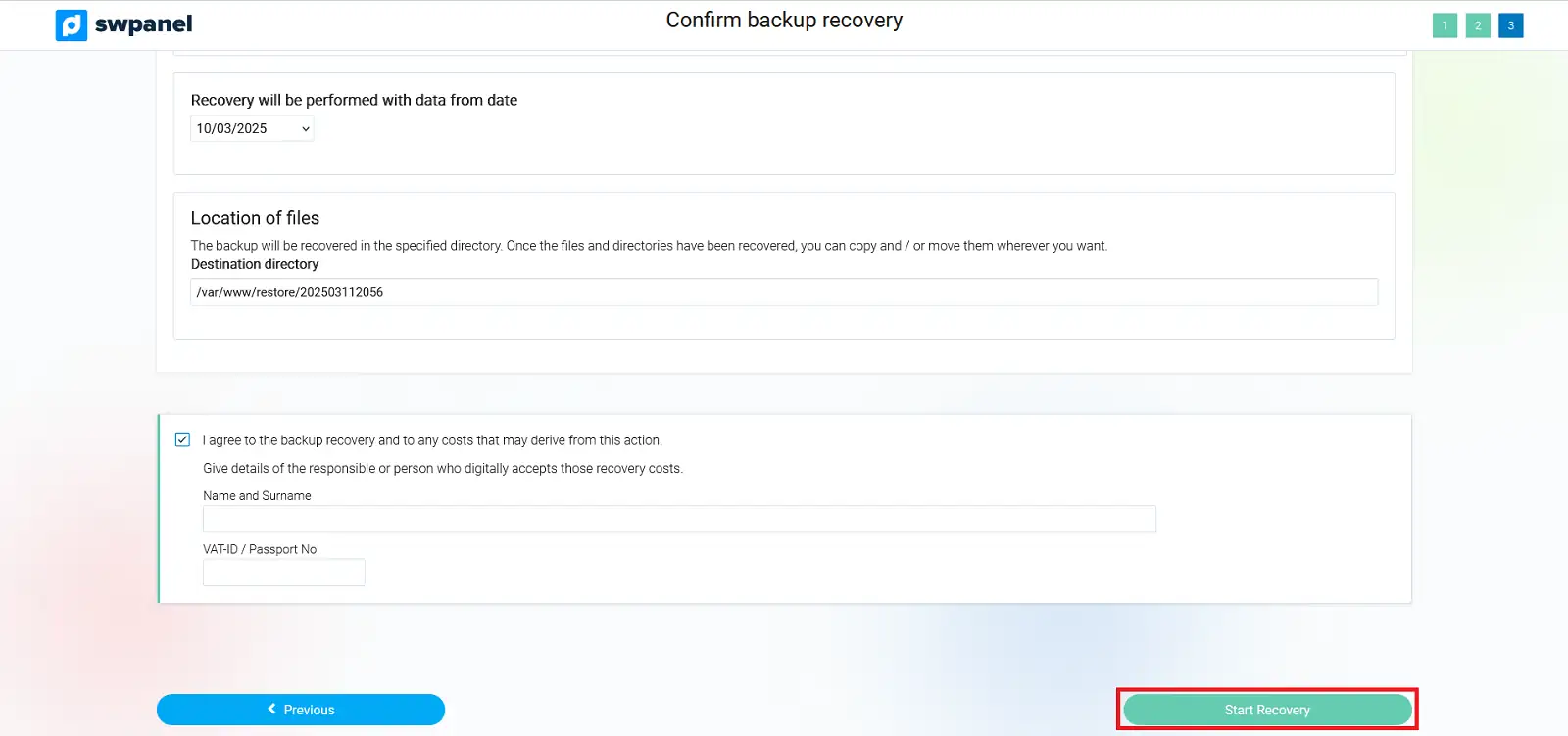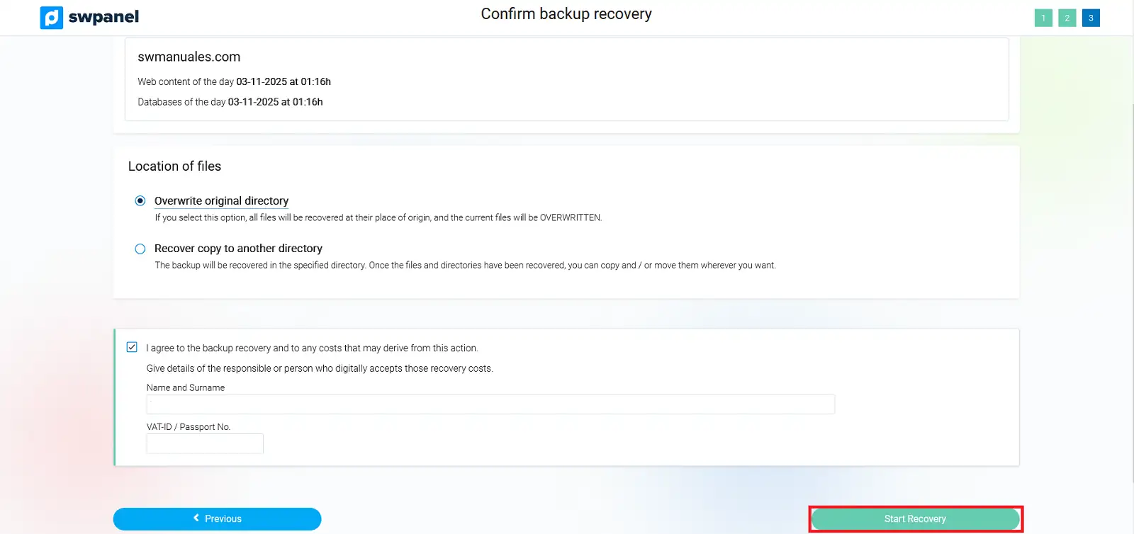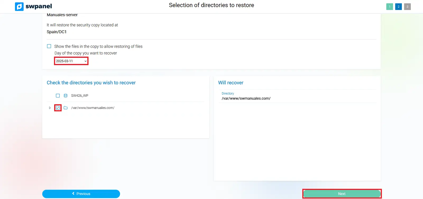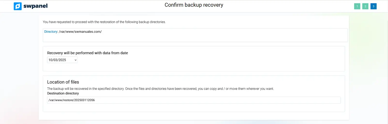 /var/backupmysql/. Cada base de dades restaurada es desarà com un fitxer .sql, que hauràs d’importar manualment./var/spool/postfix/busties/. Dins d’aquest directori hi ha una carpeta per domini i, dins de cada domini, una carpeta per cada compte de correu. Es pot restaurar tot el correu, un domini complet o un compte específic.A la següent pantalla, es mostrarà un resum amb els directoris a restaurar, la data del backup i la ubicació dels fitxers recuperats: