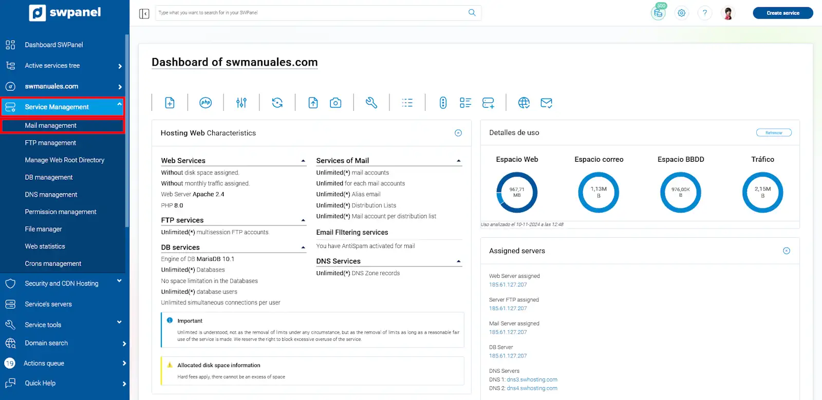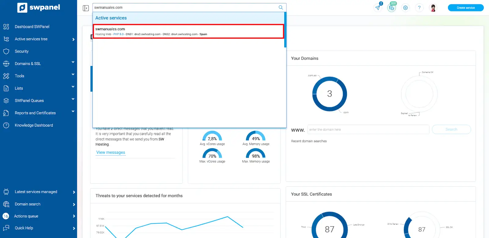 Si disposes d’un pla de Hosting o desconeixes algun dels detalls anteriors, trobaràs l’adreça d’accés a SWPanel. Per a fer-ho, accedeix al Dashboard del teu servei: