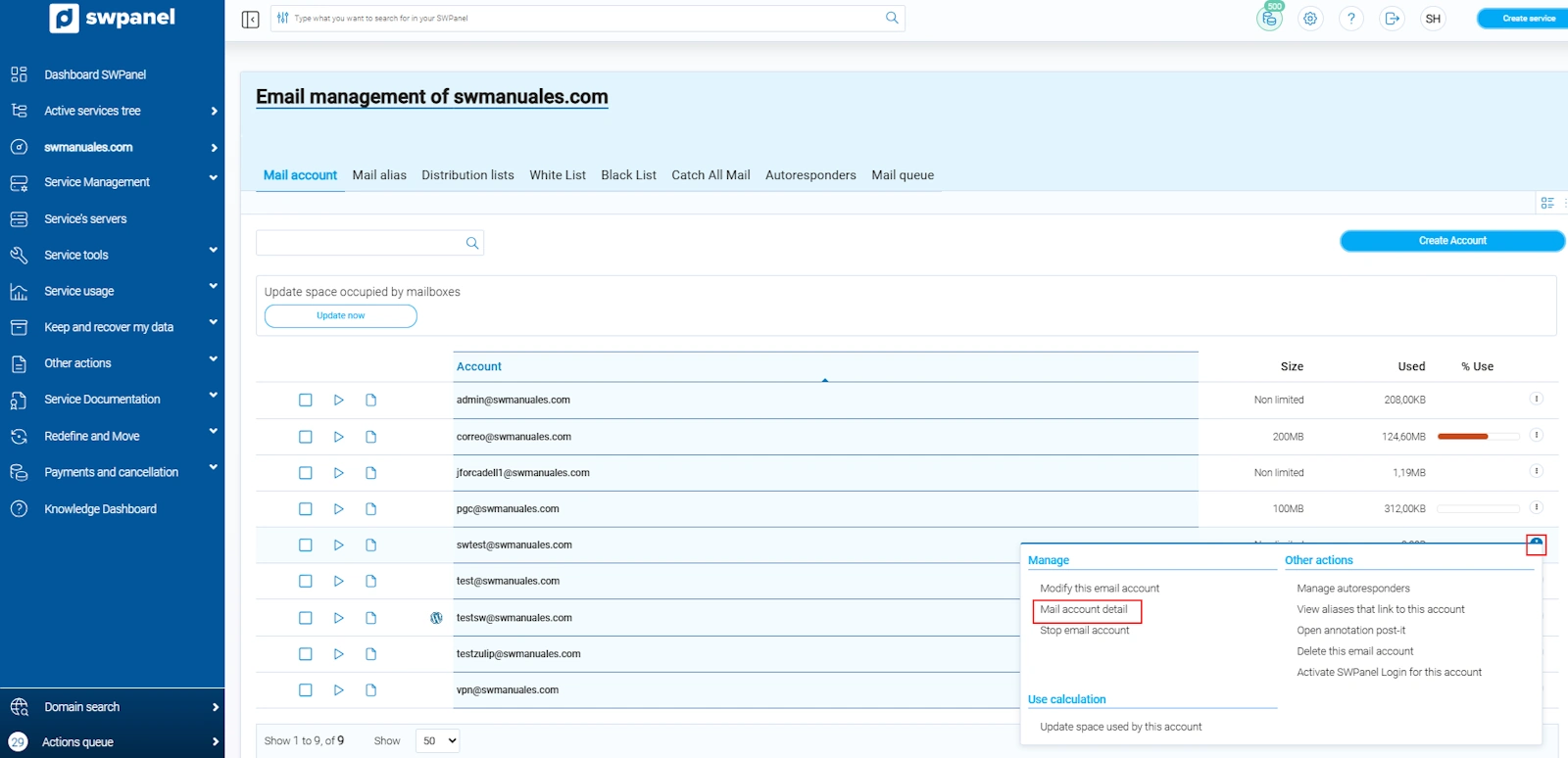 A la llista de comptes de correu, accedeix al menú Gestionar (costat dret) i fes clic a Detall del compte de correu.
