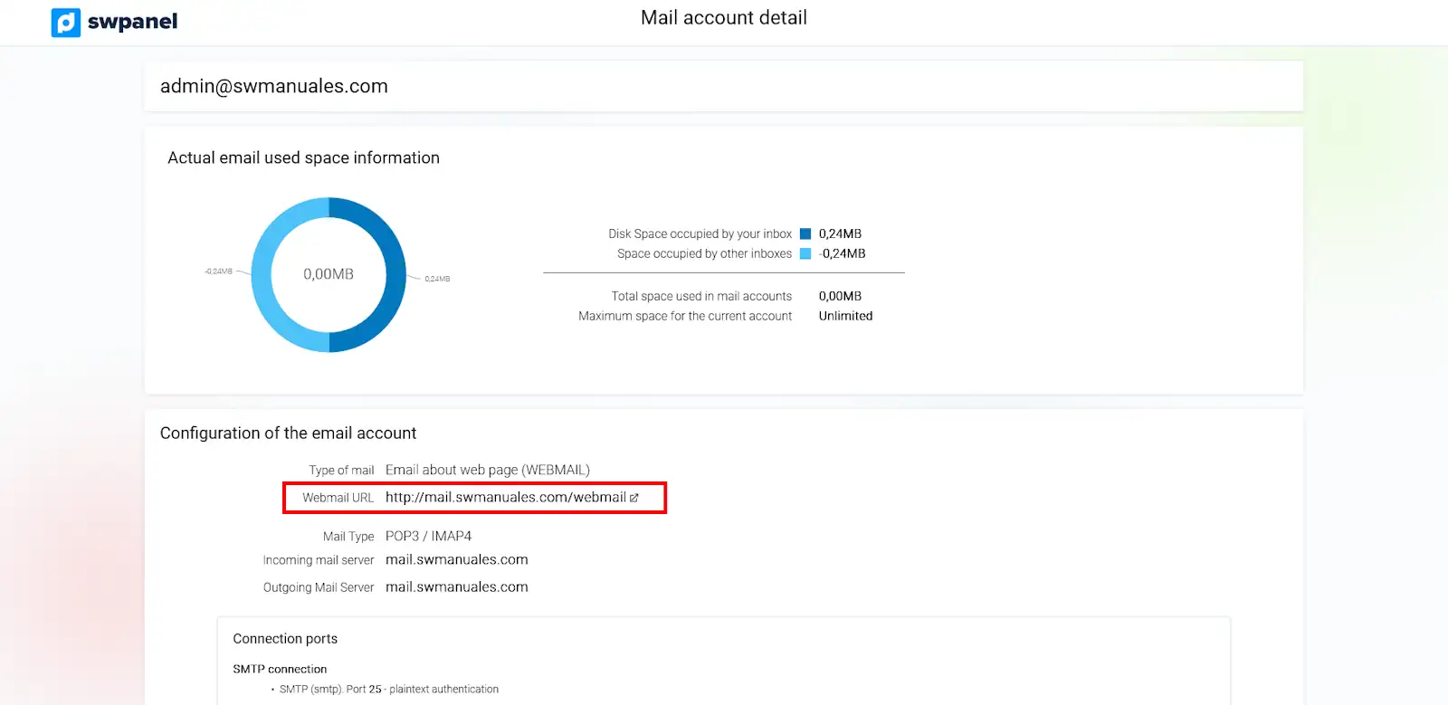 Veure en pantalla l’adreça d’accés al Webmail, així com altres paràmetres útils per configurar el compte en gestors de correu (com Outlook, Thunderbird...):