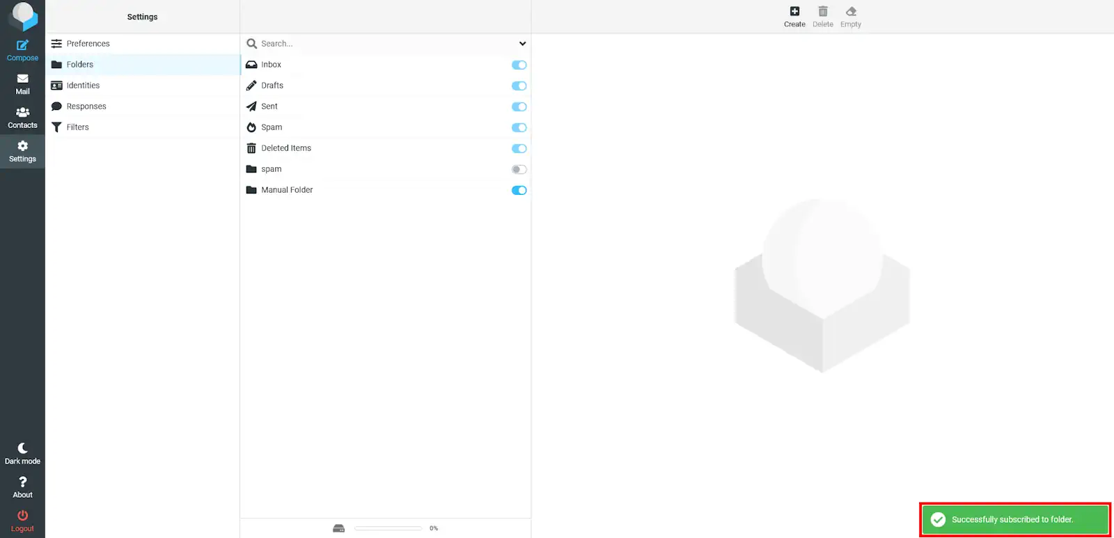 Un cop seleccionada la carpeta se subscriurà automàticament. Mostrant el missatge a la pantalla:
