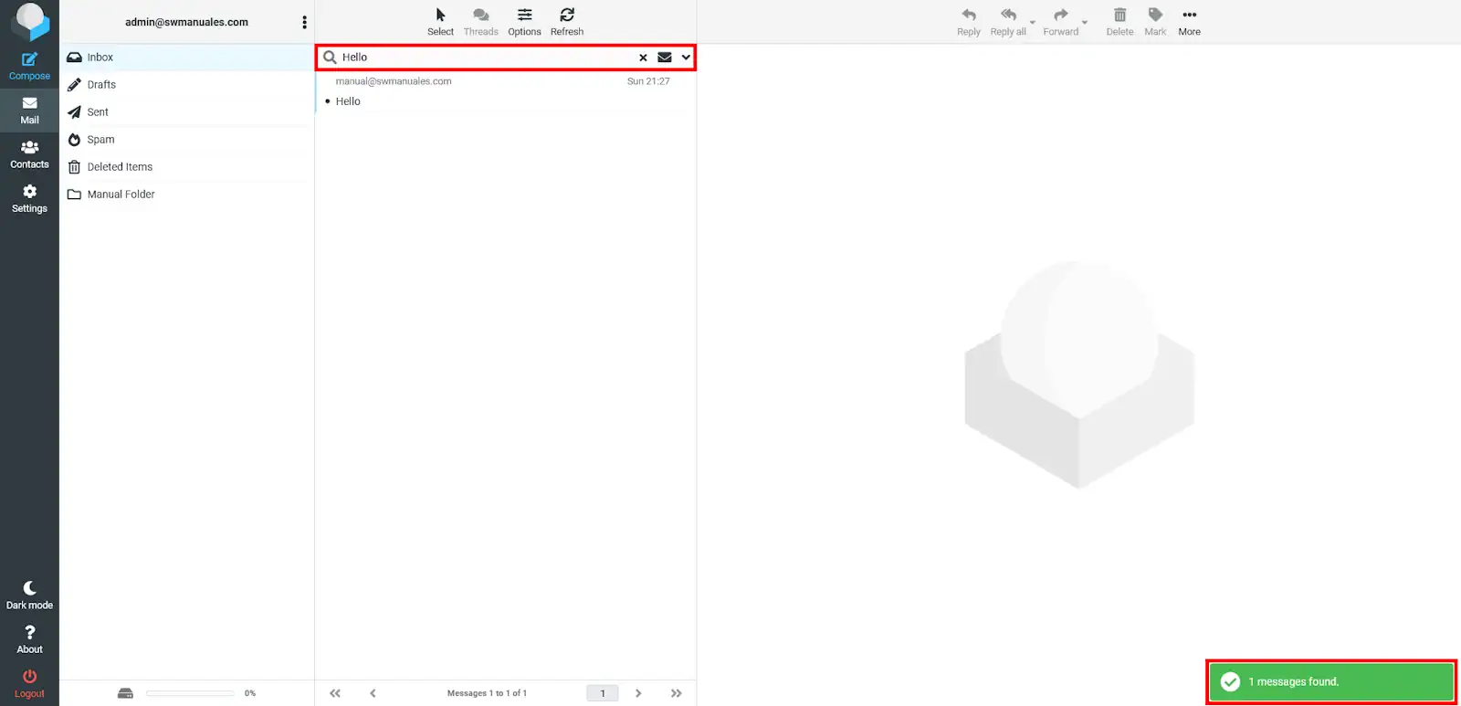 Després, cal teclejar l'email que es vol buscar i prémer la tecla enter, sortirà un missatge a baix a la dreta amb el nombre de missatges trobats.