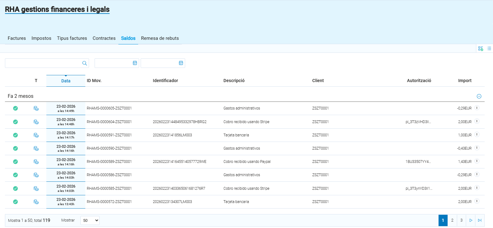 Consulta en temps real els moviments de saldo de cada client i ordena’ls per periodicitat, codi de client, mètode de pagament, import, etc. Controla deutes, estat de saldos i crèdits disponibles per obtenir una visió clara de la situació financera dels teus clients.