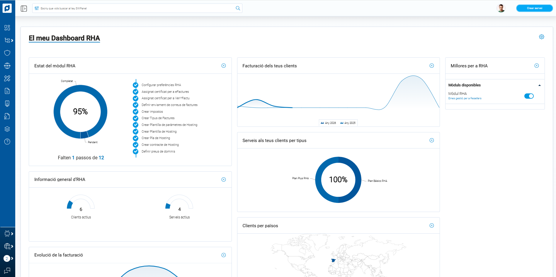El mòdul RHA d' SWPanel és una solució integral dissenyada específicament per automatitzar tots els processos administratius i financers del teu negoci digital de venta de hosting i dominis, combinant simplicitat i potència en un sol lloc.