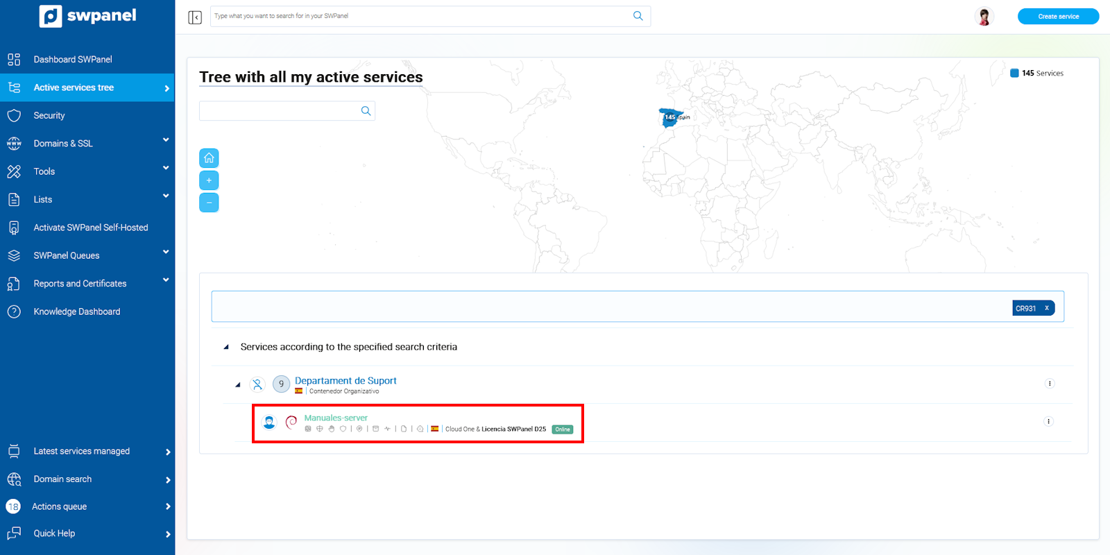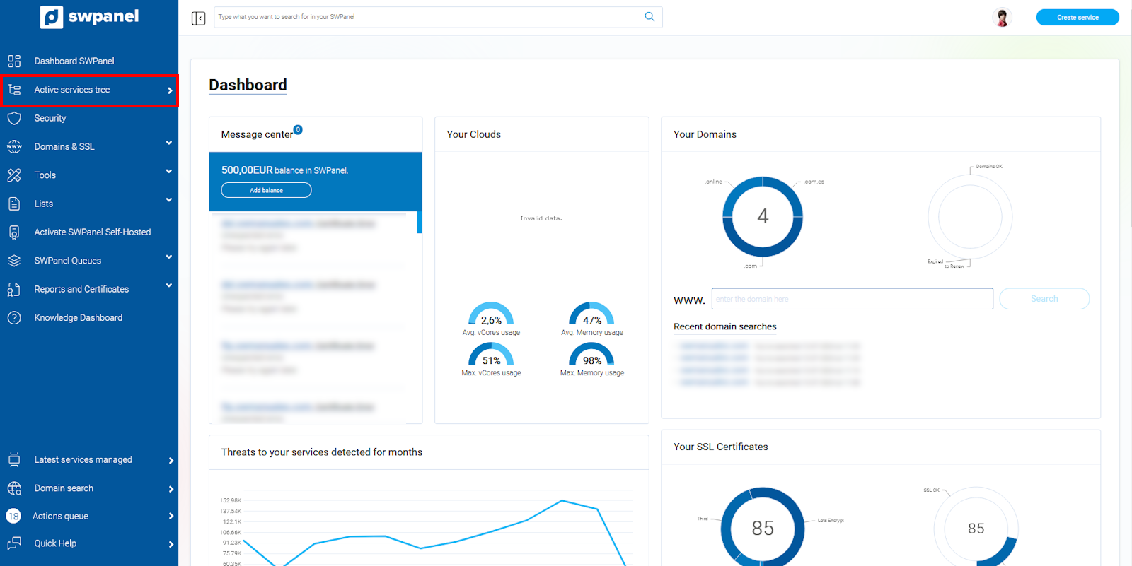 Once selected, SWPanel will show you the Dashboard of this service.