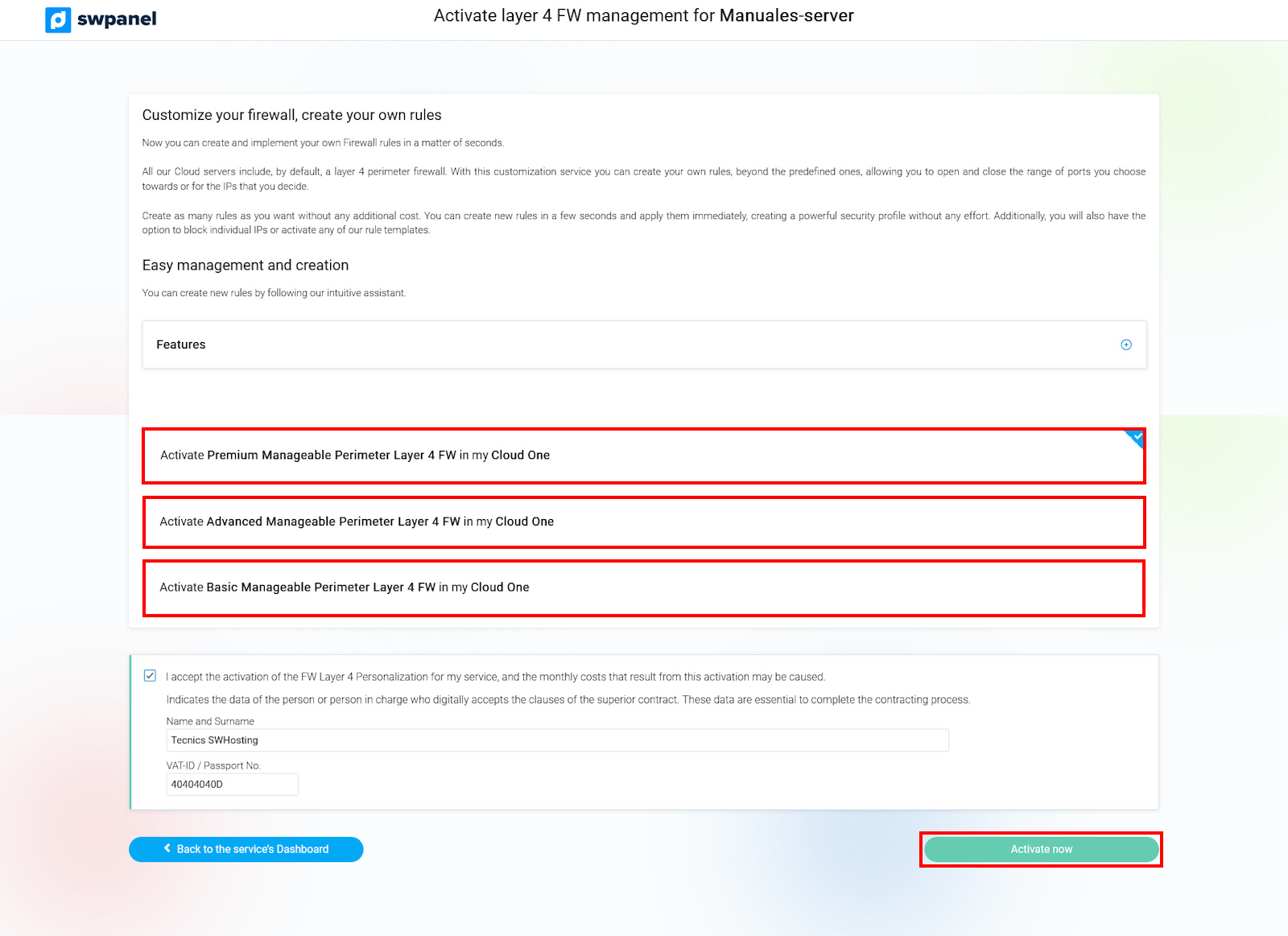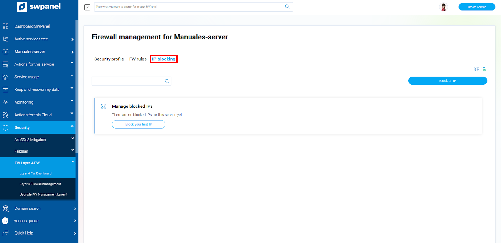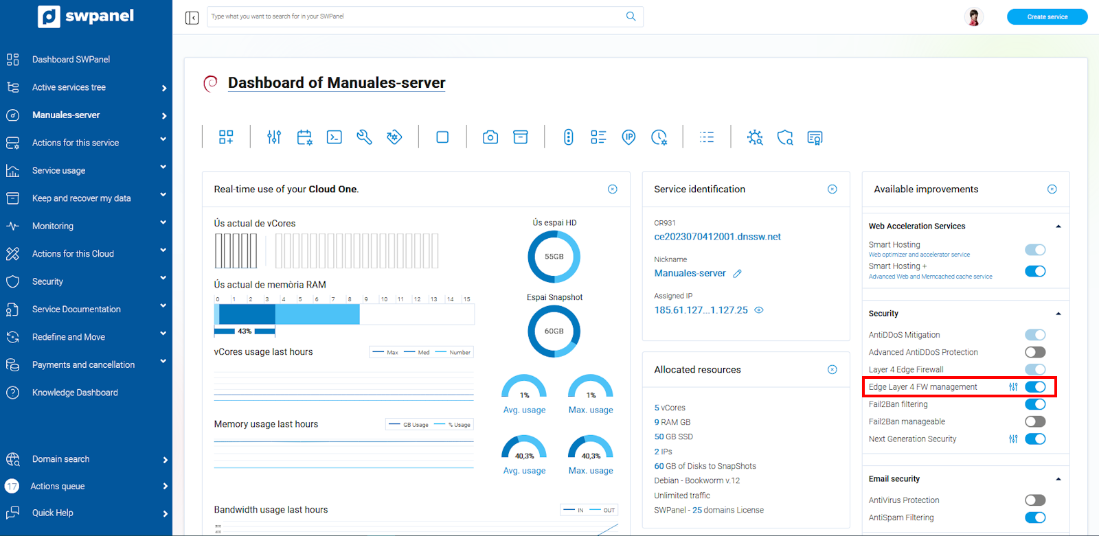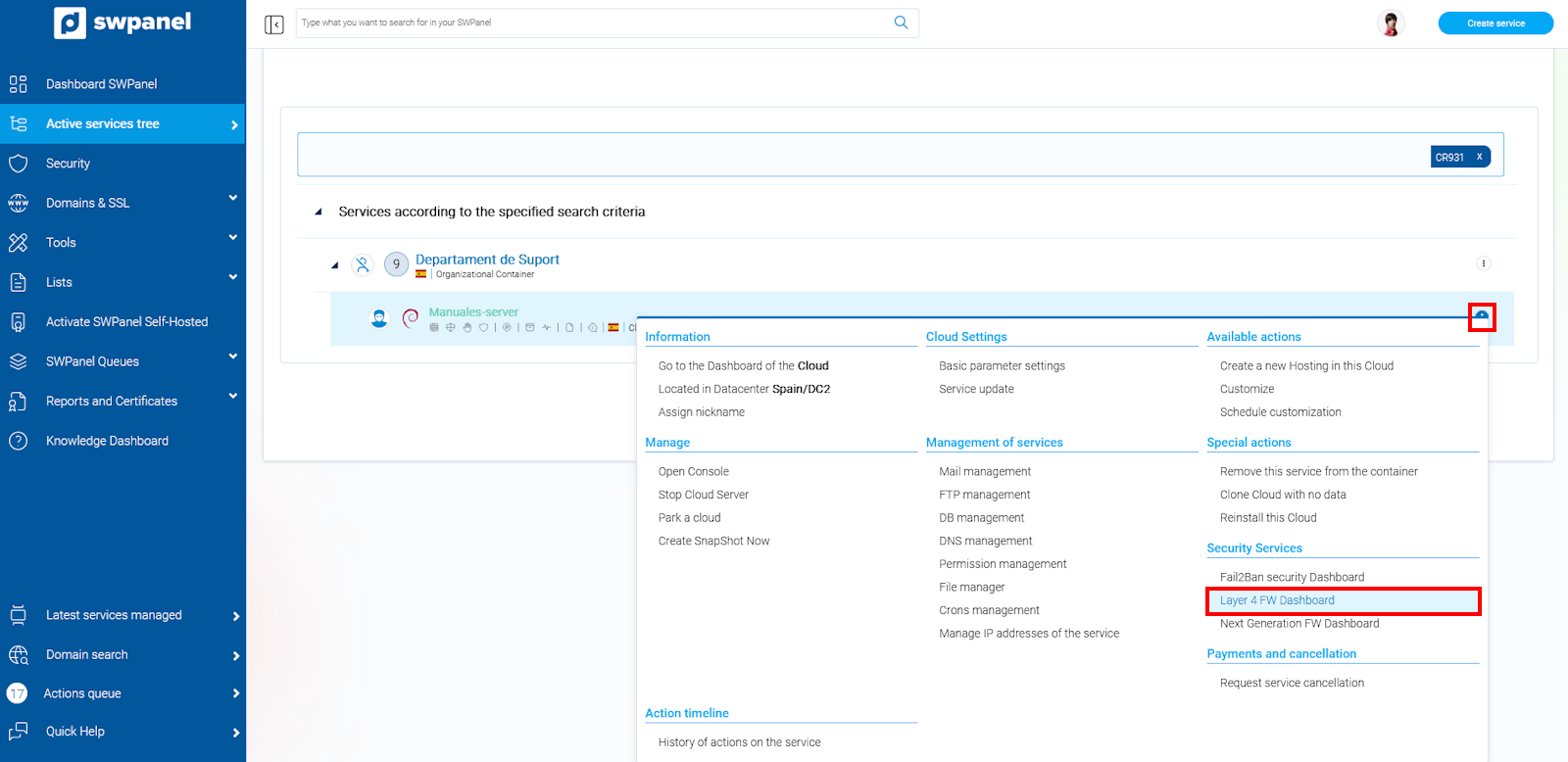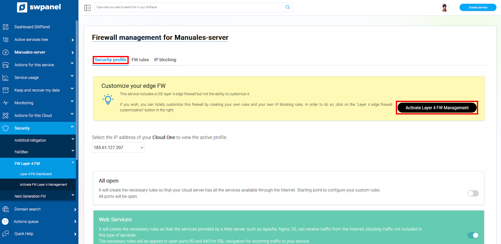 Once the management is activated, it will appear in the side menu of the SWPanel to the Dashboard of your service, within Security, in the FW Layer 4 section there is the option Layer 4 Firewall Management.