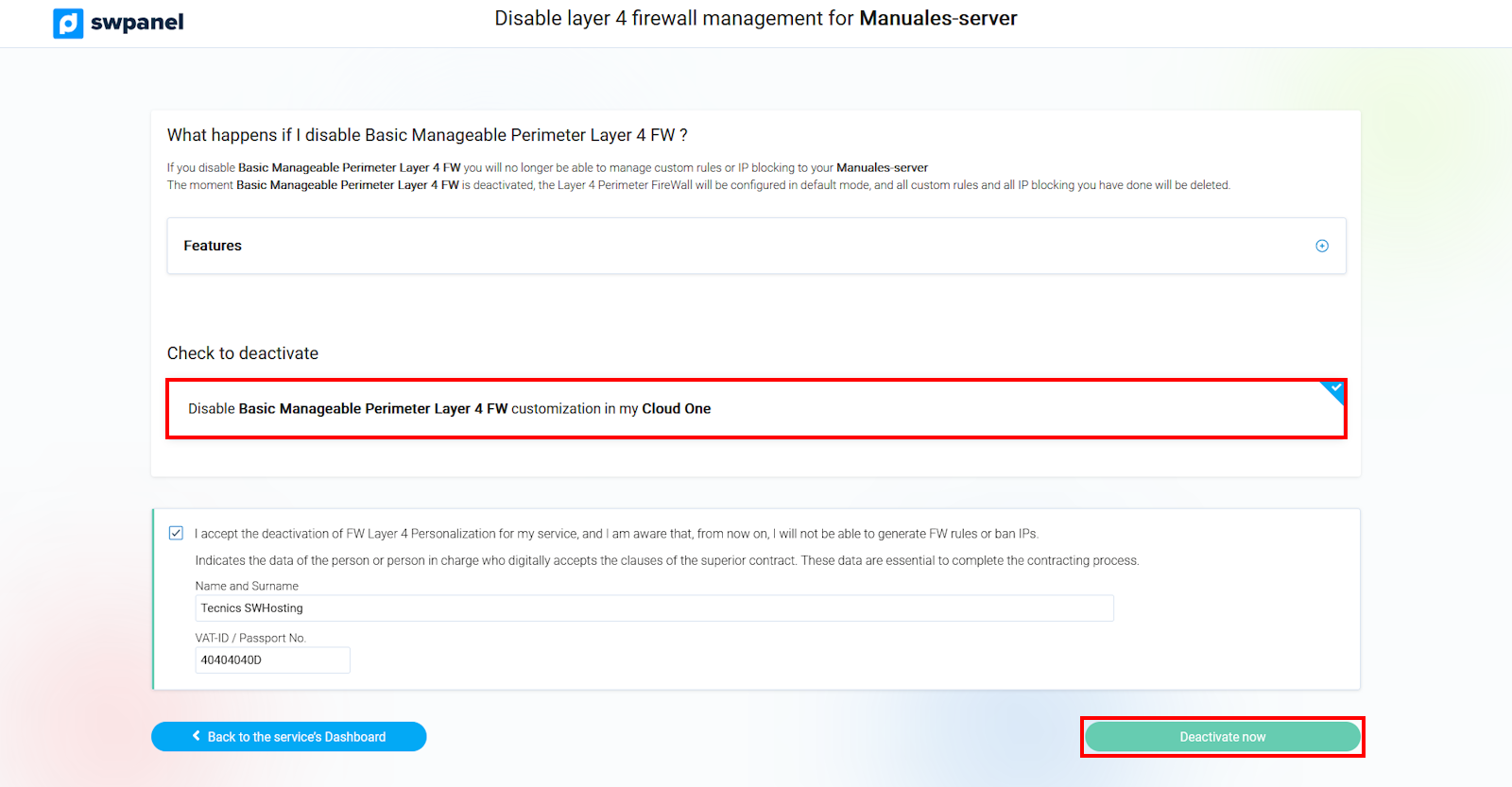 Once clicked, you will be taken to the deactivation confirmation screen. Simply check the checkbox in the blue box and confirm that you want to disable Layer 4 Firewall Management by clicking on the Disable Now button.