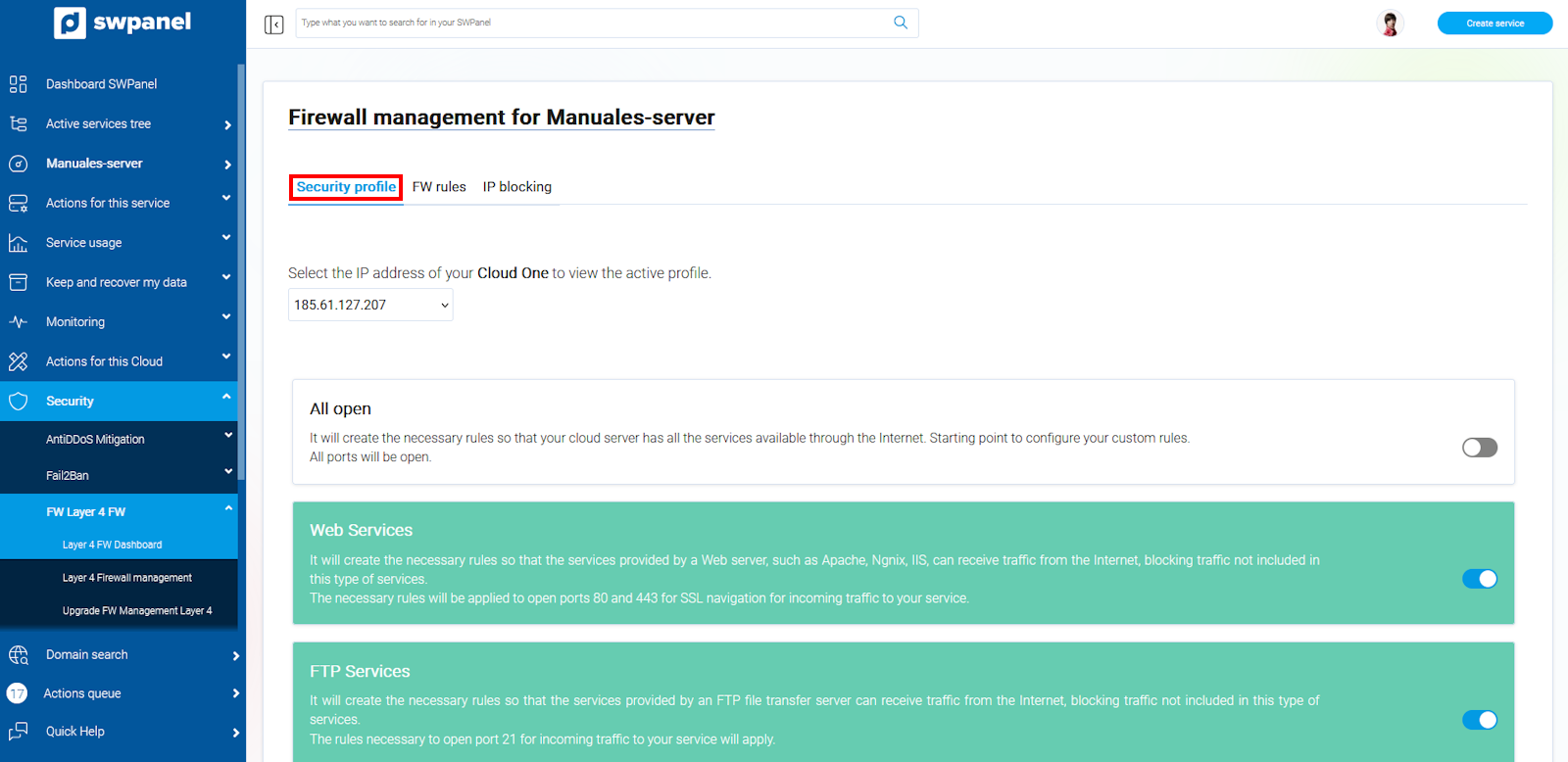 A default security profile is a set of rules already offered automatically by SWPanel, which will be applied to your Layer 4 Firewall to allow the services associated with each profile to function correctly and securely.