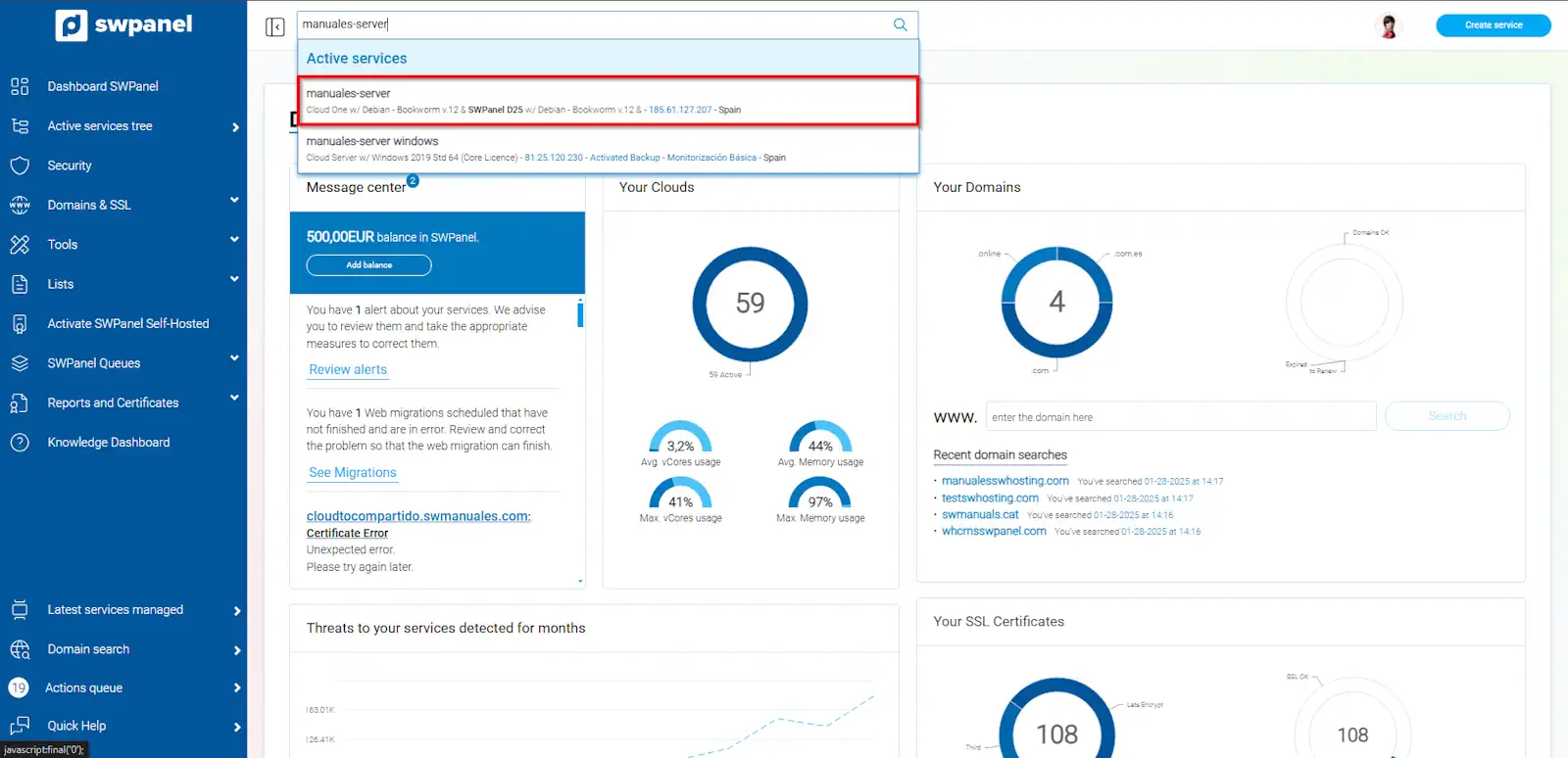 Dentro de tu SWPanel, en la ventana de búsqueda superior, indica el nombre del Cloud del que deseas extraer el certificado. Una vez localizado el servicio puedes realizar un clic sobre su nombre para acceder a su Dashboard.