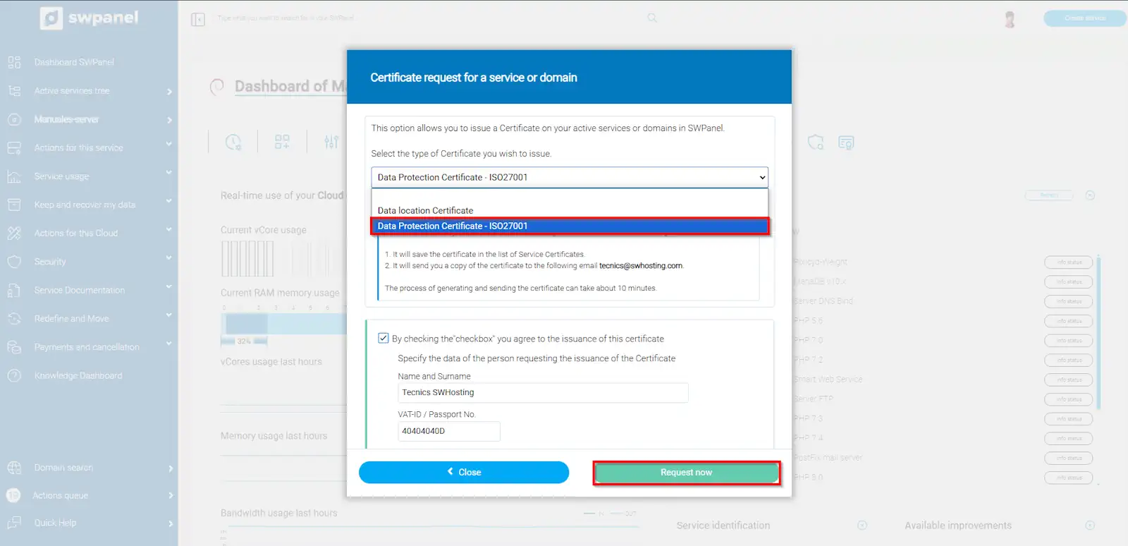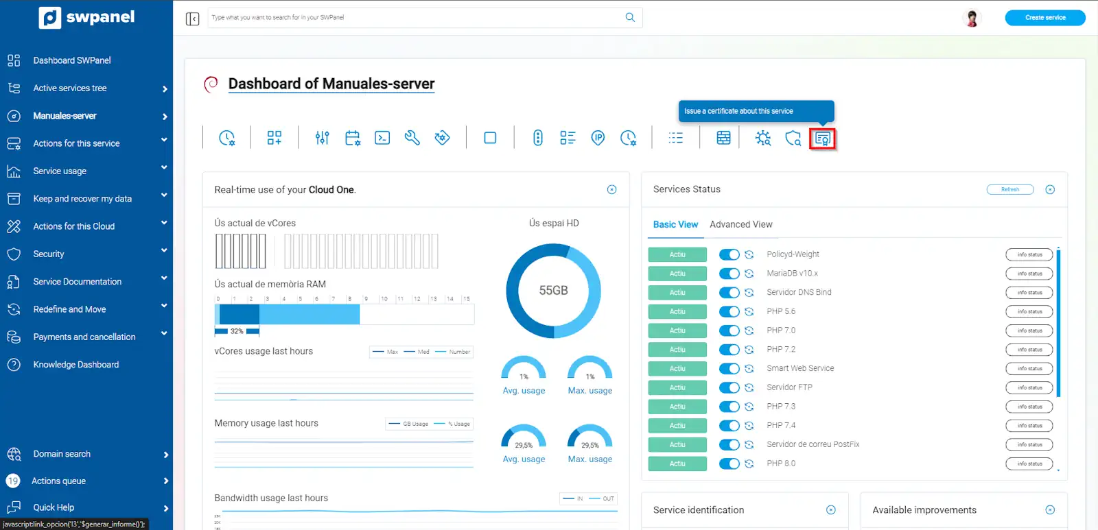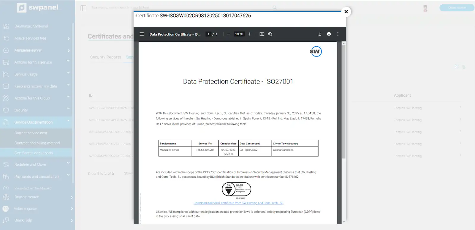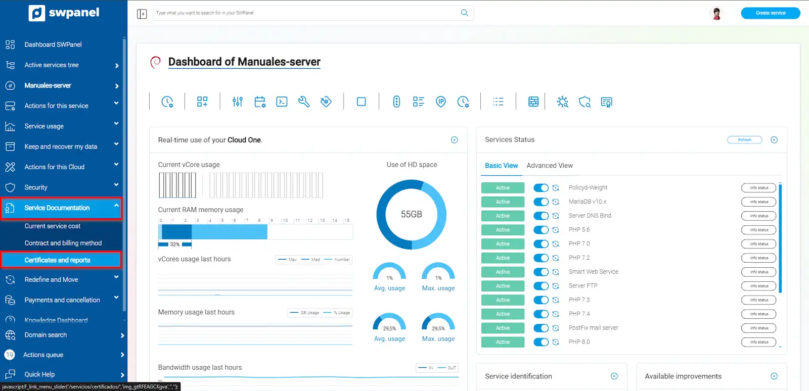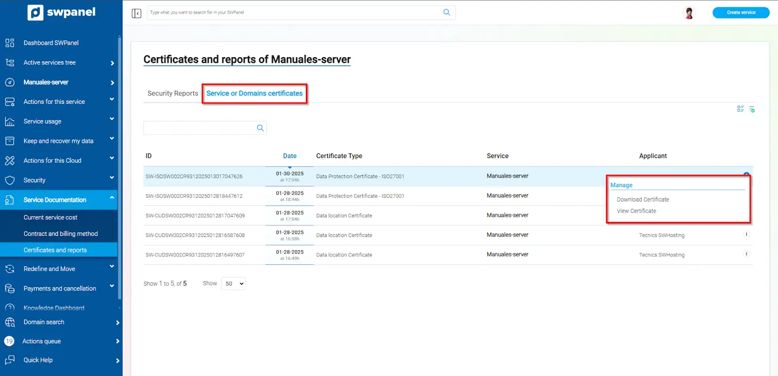 Este certificado se genera en un breve período de tiempo. Una vez solicitado ya los podrás visualizar y/o descargar desde tu SWPanel. Desde el dashboard del servicio, haz click en Documentación servicio, y a continuación Certificados e informes.