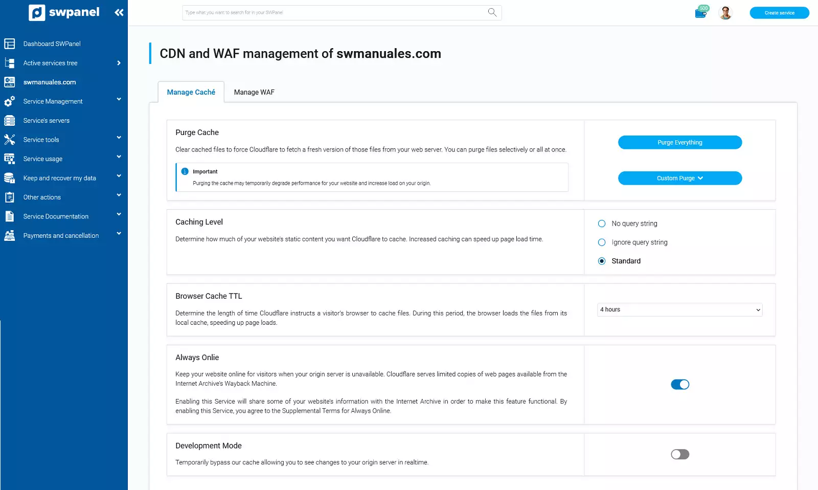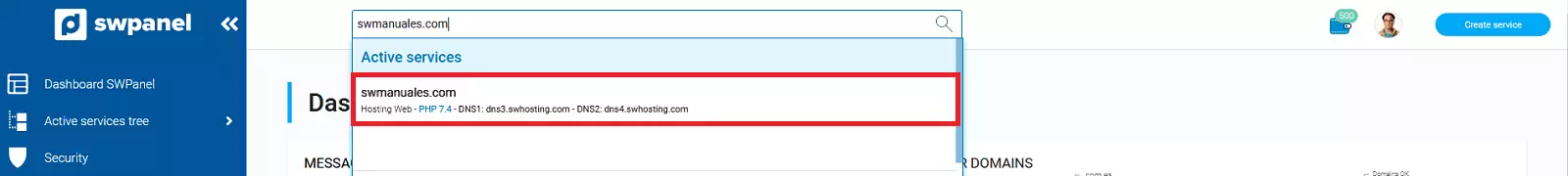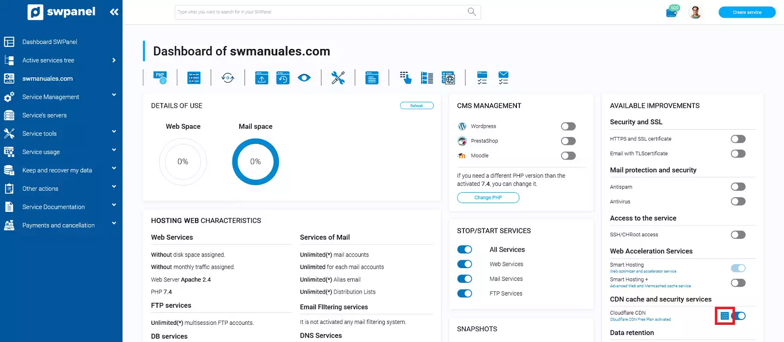 Para ajustar los parámetros de la CDN Cloudflare desde SWPanel, primero accede al dashboard de tu servicio: