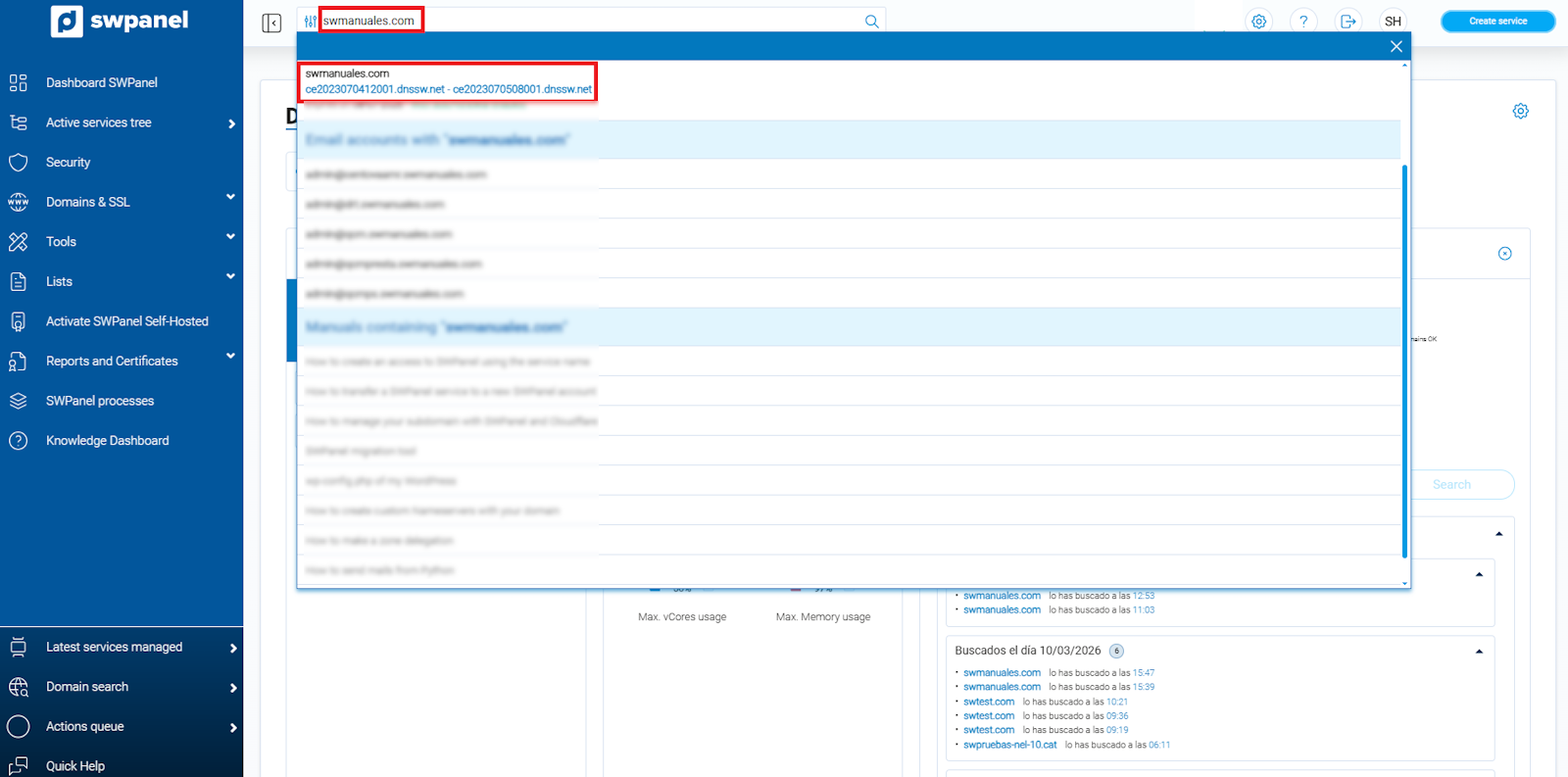 1. Dirígete al buscador situado en la barra superior del SWPanel, introduce el nombre del servicio de hosting y selecciónalo en los resultados.