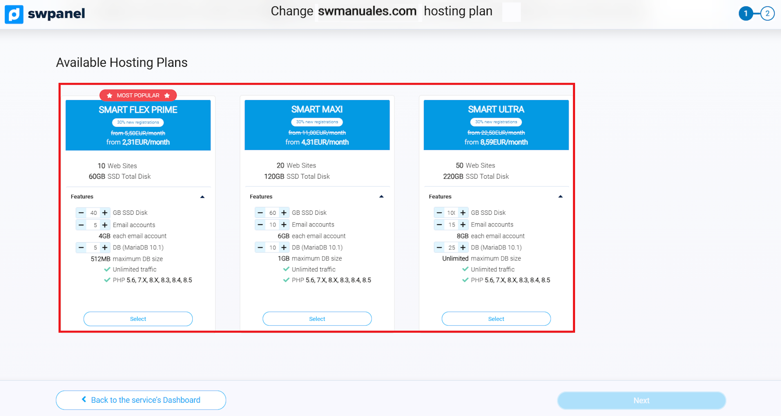 3. Una vez estés en la sección Cambiar plan de hosting, selecciona el plan que deseas contratar y haz clic en Siguiente.