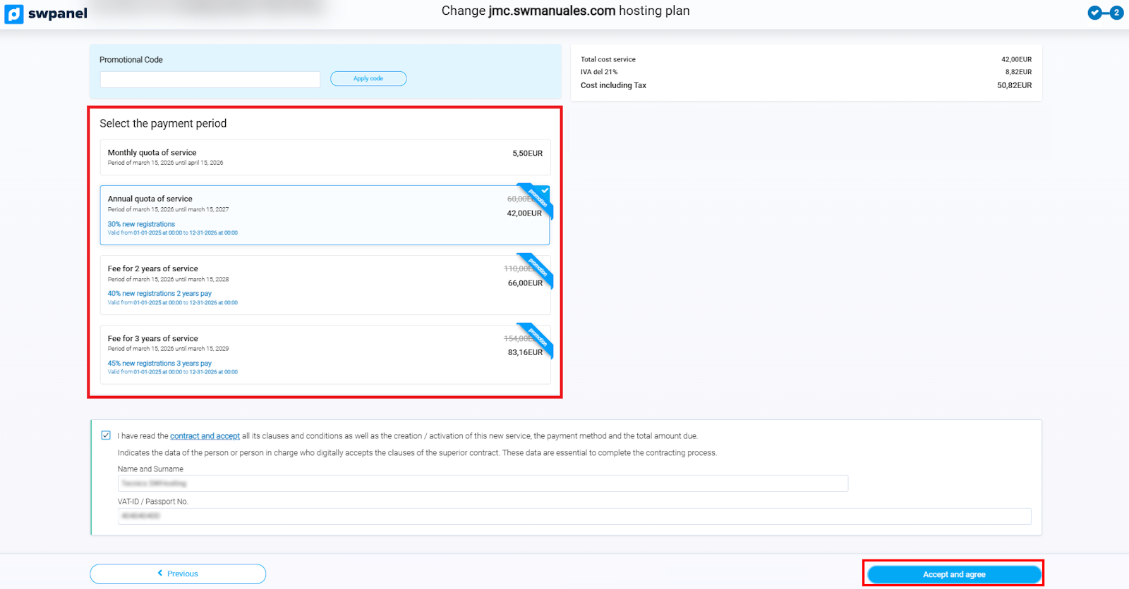 4. En esta sección, formaliza la nueva configuración del plan. Una vez revisada, haz clic en Aceptar y formalizar para completar el cambio.
