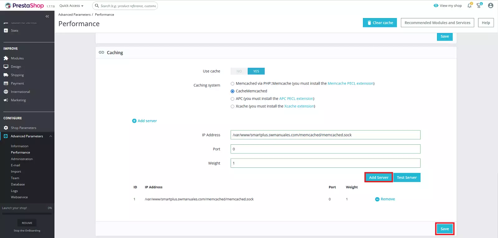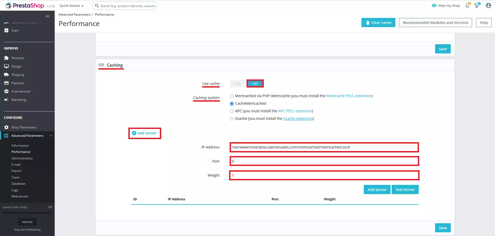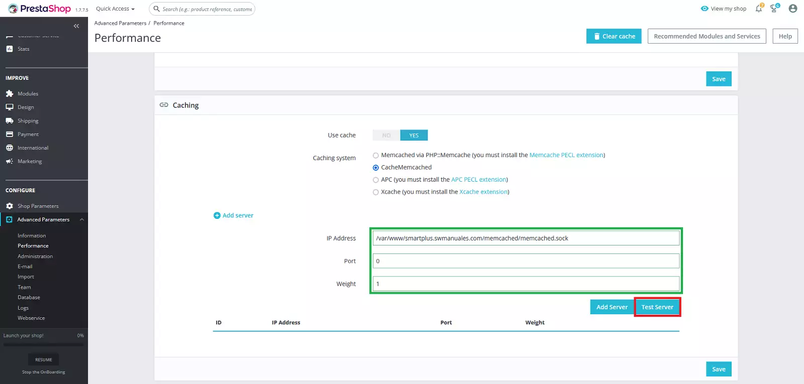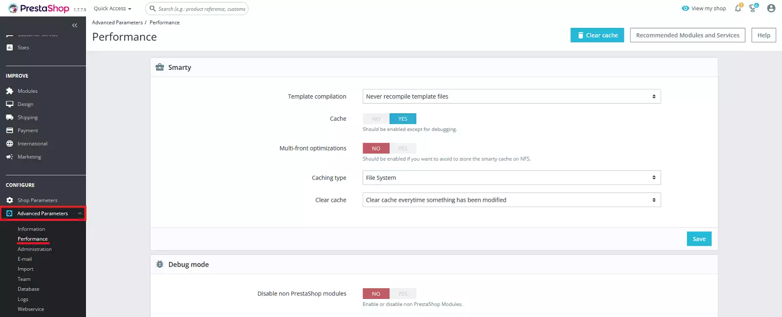 1. Accede a la interfaz de gestión de tu Prestashop y sitúate en el apartado "Parámetros Avanzados" > "Rendimiento".