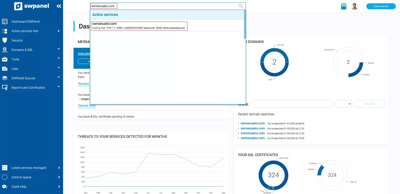1. Desde el cuadro de búsqueda de tu SWPanel, deberás localizar el servicio donde se encuentra alojada la web sobre la que quieras crear un Snapshot