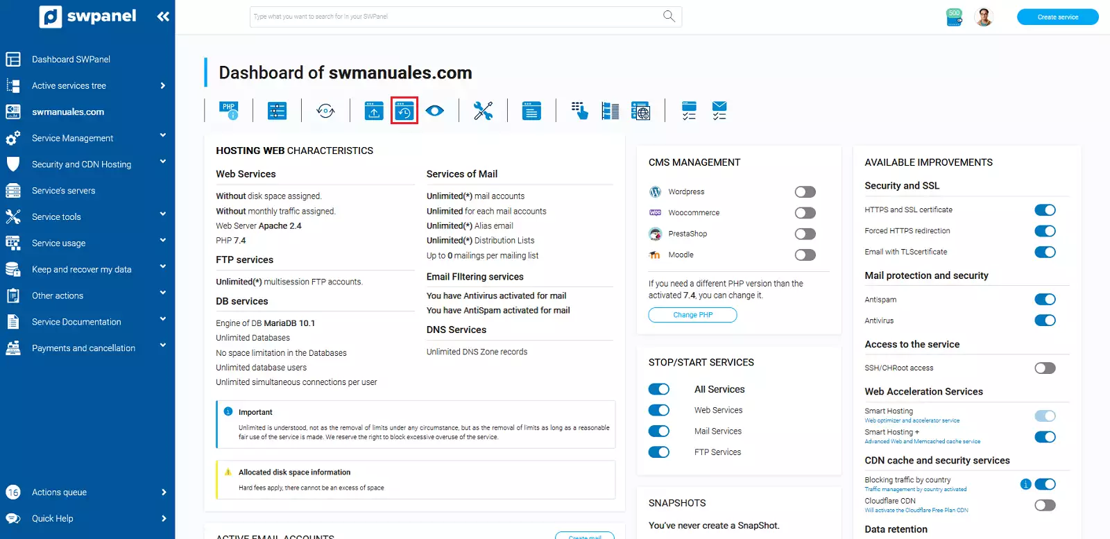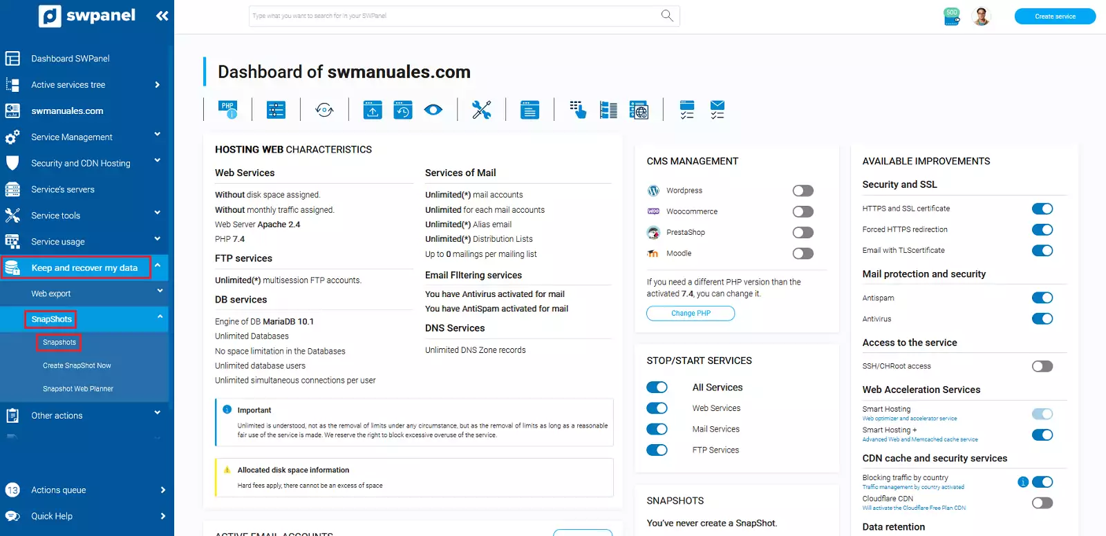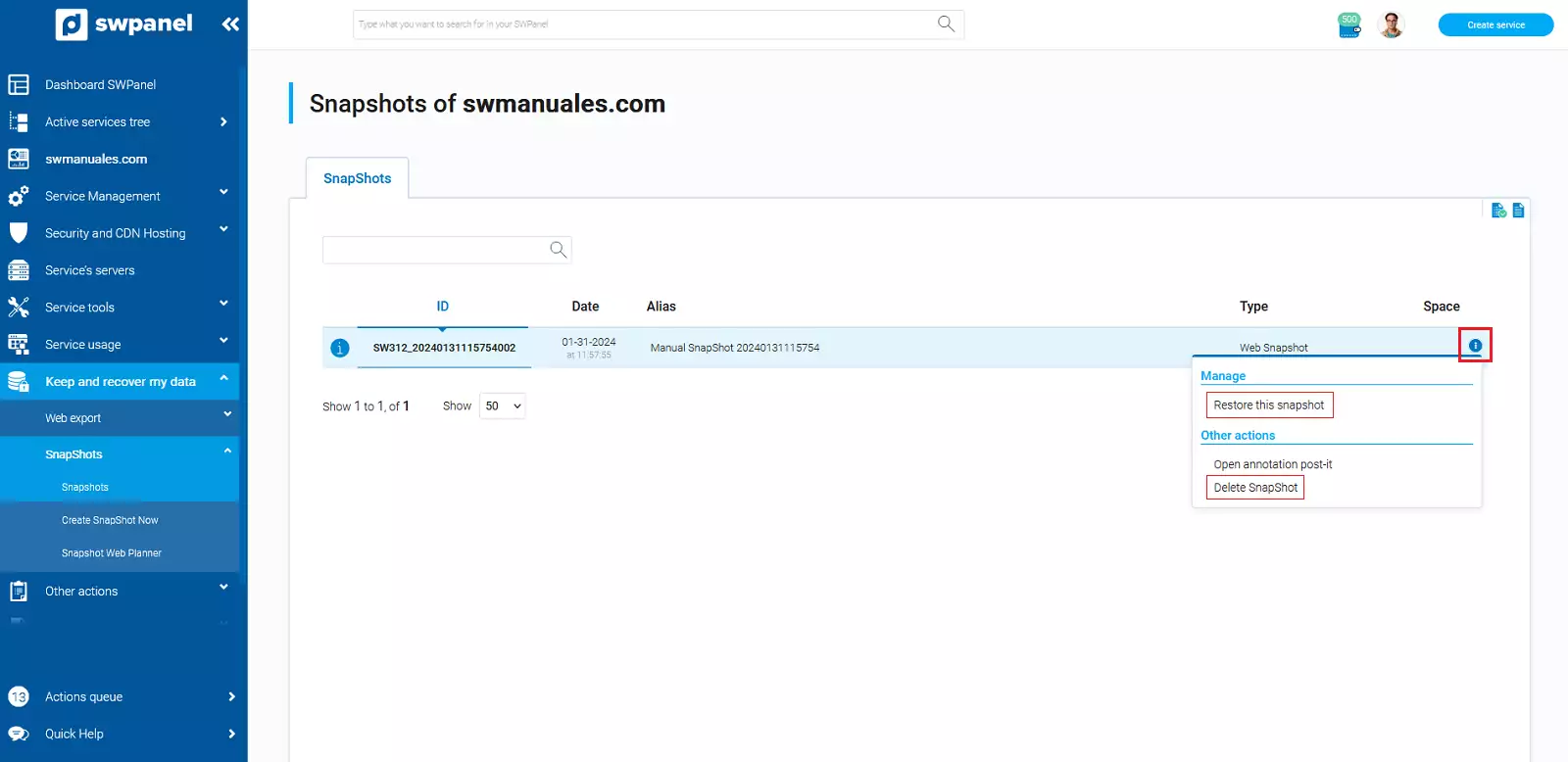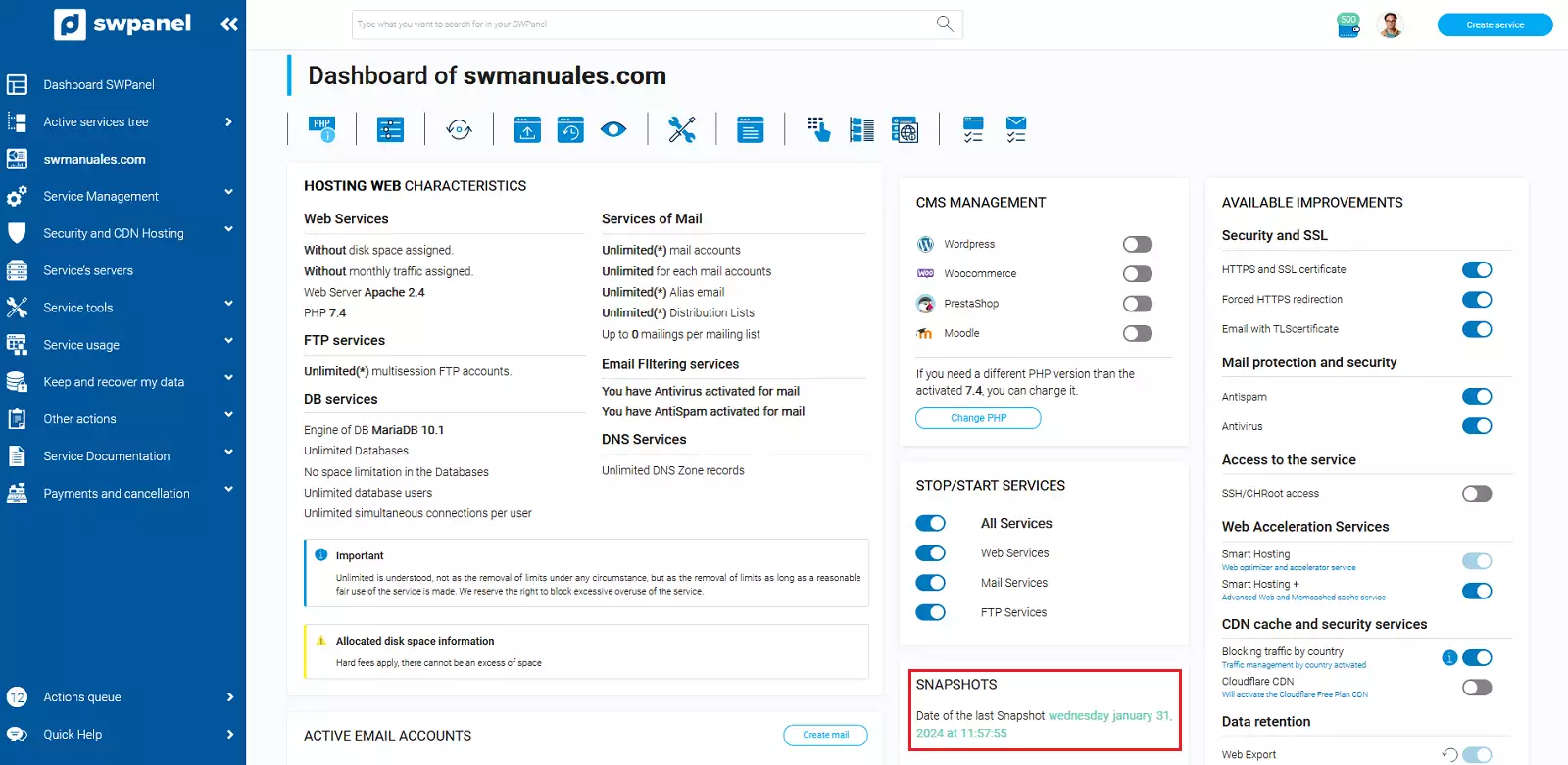 En SW Hosting puedes crear snapshots de todas tus webs, a través de tu herramienta de gestión de servicios SWPanel.