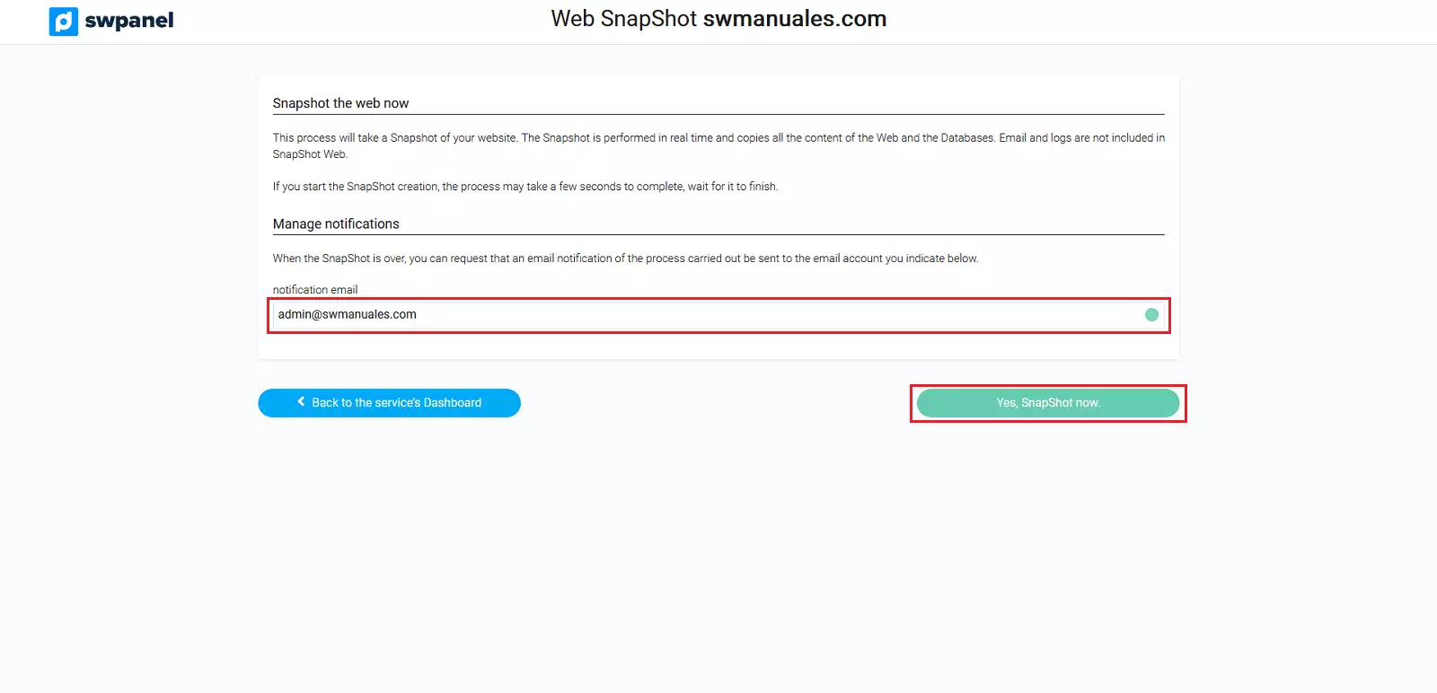 3. Indica un correo electrónico para notificar la creación de tu snapshot y haz clic en el botón "Sí, hacer Snapshot ahora"
