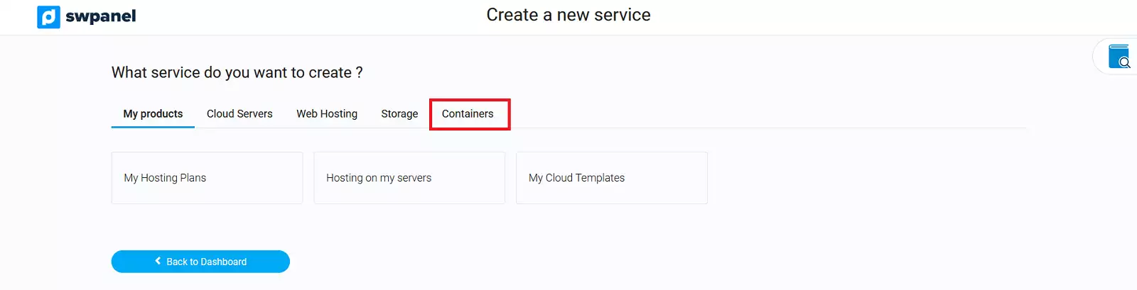 Entre todos los posibles servicios que puedas crear con tu SWPanel, escoge "Contenedores"