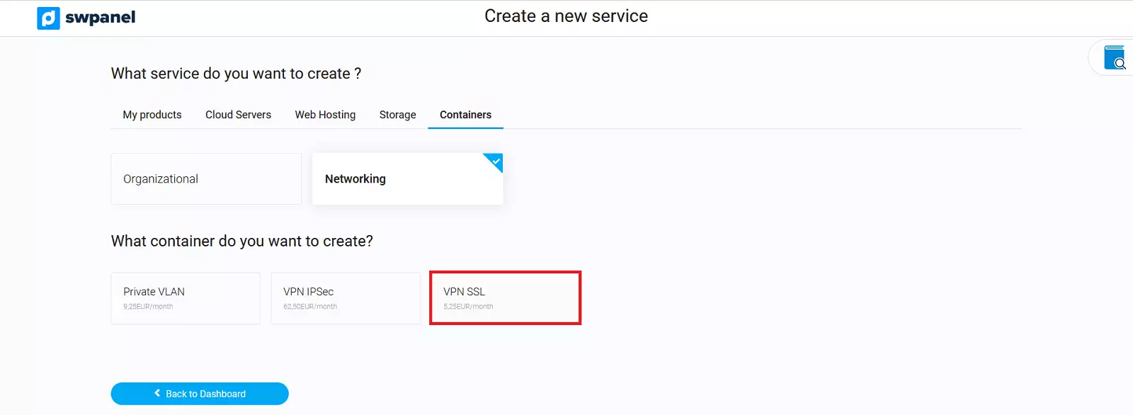 Para crear una VPN, en primer lugar, debes incluir tu servidor o servidores Cloud en una VLAN (Red de Área Local Virtual) a través de SWPanel.