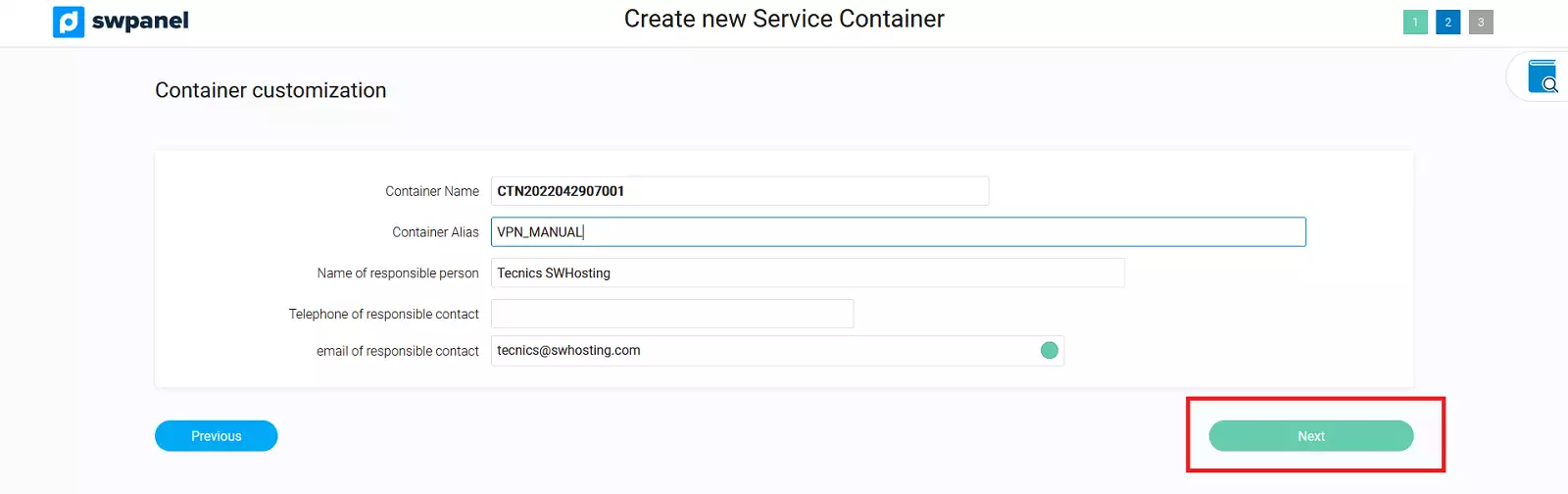 En la siguiente ventana podrás definir el sobrenombre del contenedor de VPN con el que se identificará en tu SWPanel. También, podrás indicar el nombre del responsable, así como su teléfono y email.