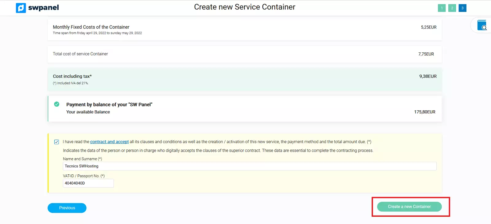 En la siguiente ventana se resumirán los costes correspondientes a la creación de la VPN SSL , según el número VLAN que hayas añadido a la misma. Para aceptar la creación de la VPN SSL, deberás pulsar el botón "Crear Nuevo Contenedor"