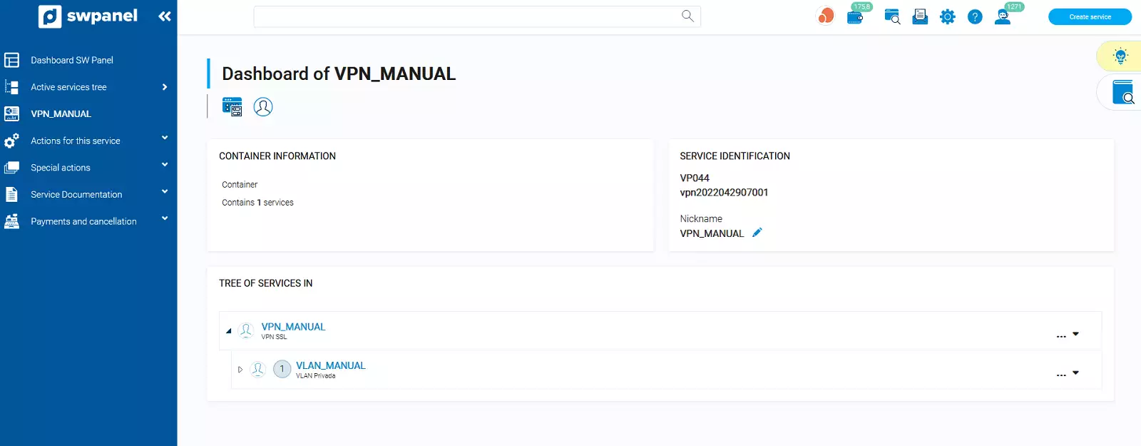 Una vez creada tu VPN SSL, podrás gestionar las VLAN incluidas en la misma y sus usuarios de acceso, desde su Dashboard en tu SWPanel.