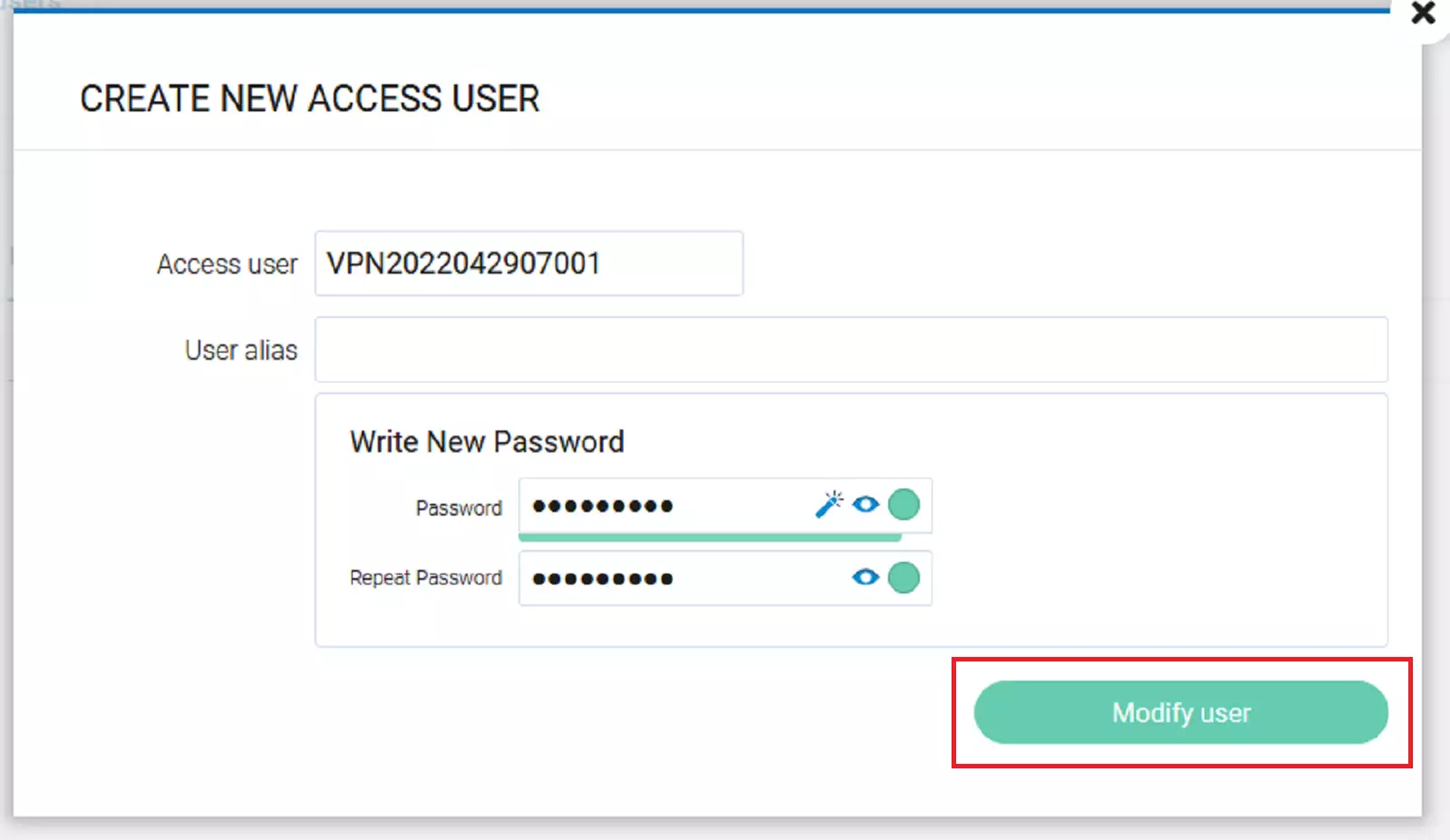 En el apartado correspondiente a los datos de acceso, toma nota del usuario de acceso a tu VPN e introduce la contraseña que prefieras. Una vez definidos los datos, deberás hacer clic en el botón "Siguiente".