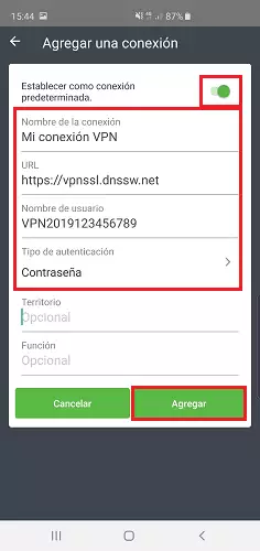 Establecer como conexión predeterminada: Si solo vas a hacer uso de esta conexión VPN SSL, recomendamos activar esta opción.