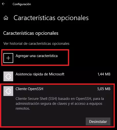 Examina esta lista para ver si el cliente de OpenSSH ya está instalado. Si no es así, en la parte superior de la página, selecciona "Agregar una característica" y busca "Cliente de OpenSSH" y, a continuación, haz clic en "Instalar".
