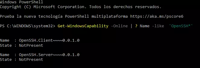 Get-WindowsCapability -Online | ? Name -like 'OpenSSH*'